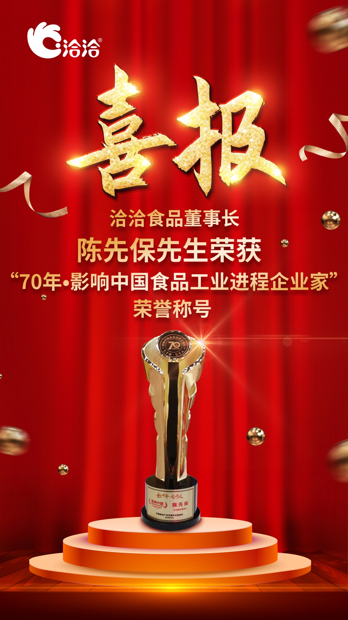 12月6日,“榮耀七十年·走進(jìn)新時代——2019中國食品產(chǎn)業(yè)發(fā)展年會暨2019(第四屆)華糖萬商領(lǐng)袖大會”在鄭州隆重召開。70年?食業(yè)改變中國,為表彰致敬70年來為中國食品工業(yè)做出杰出貢獻(xiàn)的企業(yè)家,大會開展了“70年?70人——全民推選影響中國食品工業(yè)進(jìn)程企業(yè)家”評選活動,眾多全國食品工業(yè)領(lǐng)域的杰出企業(yè)家成為推選人物。最終通過全民票選,洽洽董事長陳先保先生獲頒“70年?影響中國食品工業(yè)進(jìn)程企業(yè)家”榮譽(yù)稱號。 榮耀70年,走進(jìn)新時代!奮戰(zhàn)20年,展望未來,